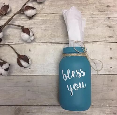 As we enter the peak of cold and flu season, be prepared for whatever sickness or allergies that (unfortunately) come your way. Display your tissues in these adorable, colorful, and hand-decorated mason jars. They even come in festive holiday colors, like bright red and and snow white.