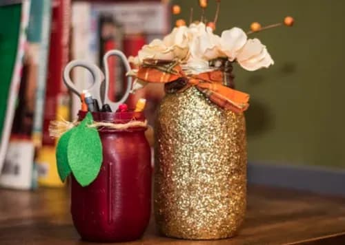 Fill these sparkly gold mason jars with pens, pencils, scissors, and any other crafting tools you may keep at your desk. Place them next to your new scarecrow, and you are officially Halloween queen of the office.