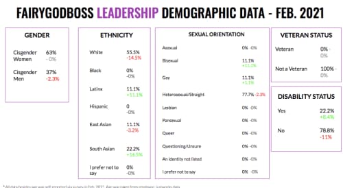 As a community focused on helping all women achieve their career goals, Fairygodboss is committed to diversity in the workplace — including our own company's diversity and inclusion efforts. While we believe most startups our stage and size do not measure their demographic diversity, we are committed to surveying our small group of employees on their demographics, and to publishing and updating that information regularly.