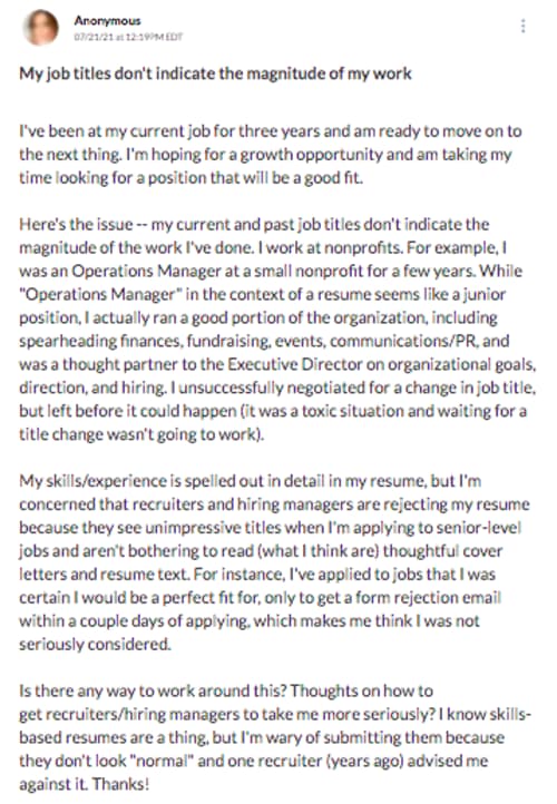 Should you change the job title in your resume? Should you go for a skills-based resume? That's what one woman asked recently in the Fairygodboss Community in this post: