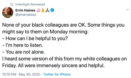 As Danielle Cadet explained in an essay for Refinery29: your Black colleagues, way more than likely, aren’t OK right now. That’s a given. Wanting to express support — appropriate examples of which are included below — is one thing. Posing questions in a way that essentially asks to mine your colleague’s personal trauma is another.