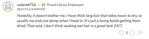 After clarifying that it “honestly doesn’t bother,” as she herself has long hair which “takes hours to dry,” FGB’er aclaire6713 added that she doesn’t think “wet hair is a great 24/7 look,” however.