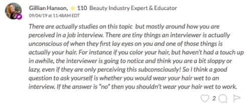 “What do you think about wearing wet hair to work… is it unprofessional, or is it something that can be looked past?” she asked.
