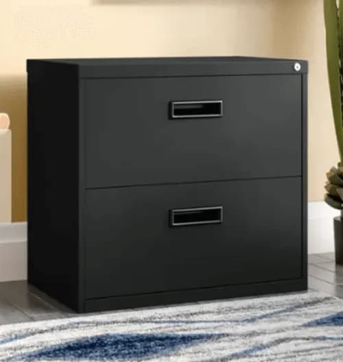 This lateral cabinet has two lockable drawers. It features a simple, clean design that will fit in with most aesthetics.