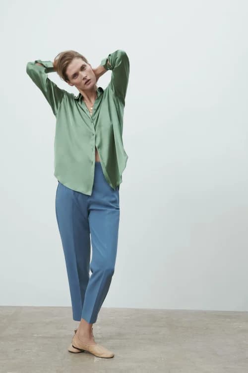 Want to add a splash of color to your outfit? This satin-effect blouse paired with a blazer and slacks will do the trick. Buy it at Zara.