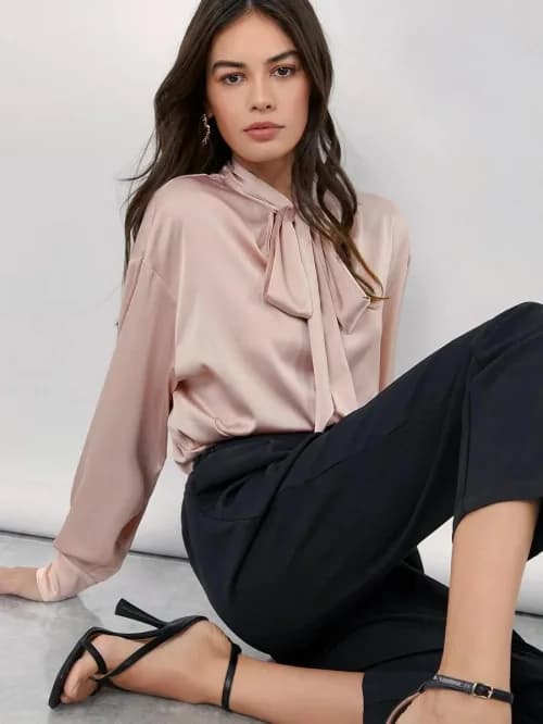 This satin blouse is available in many gorgeous colors and works well with a black blazer and slacks. Buy it at SHEIN.