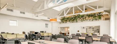 The Yard in an industrial-style space with private offices and dedicated desks all overlooking downtown NYC. The space also has a roof deck among other common spaces, private penthouse offices and more. Members can enjoy after-hours networking events in the common areas, as well.