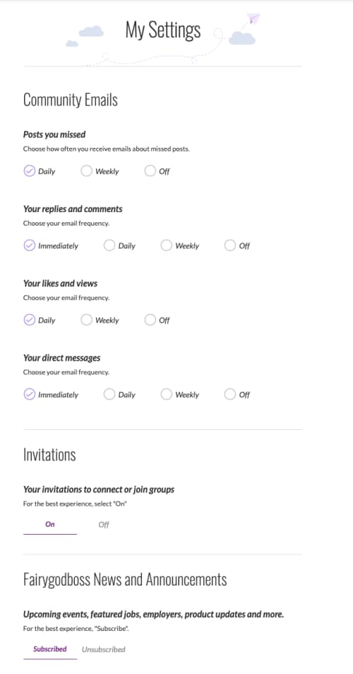 There are two types of Fairygodboss emails: news & announcements and community emails. News & announcements emails are curated by the Fairygodboss team to deliver you information about our content, upcoming events and other opportunities you may be interested in. Community emails keep you updated on open jobs and what’s happening in the FGB Community — and if you have any other questions about Fairygodboss, we'd love to invite you to our Fairygodboss FAQ page to get more of your questions answered.