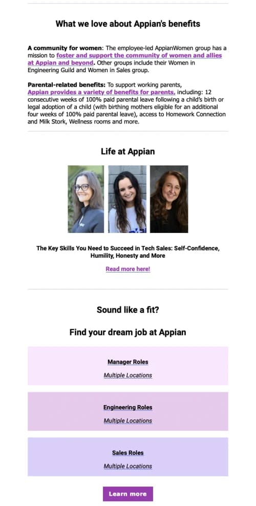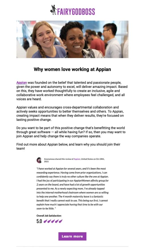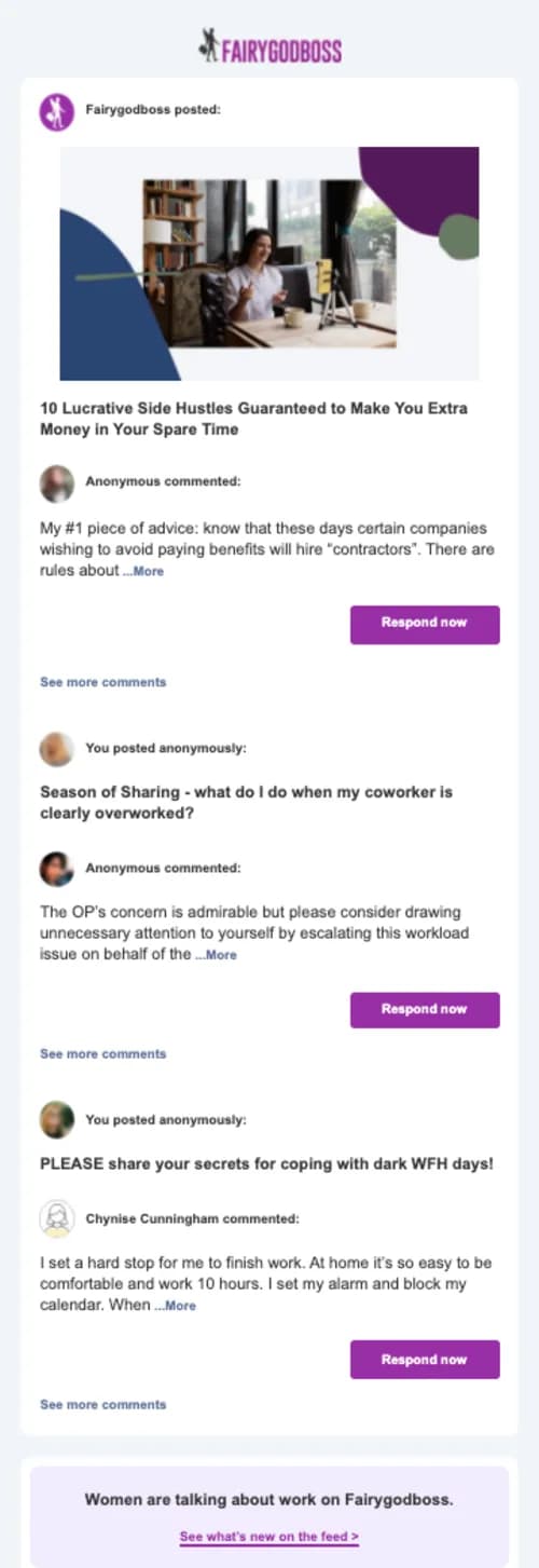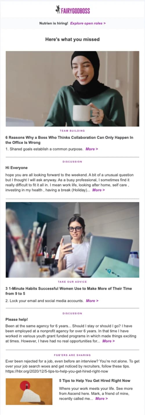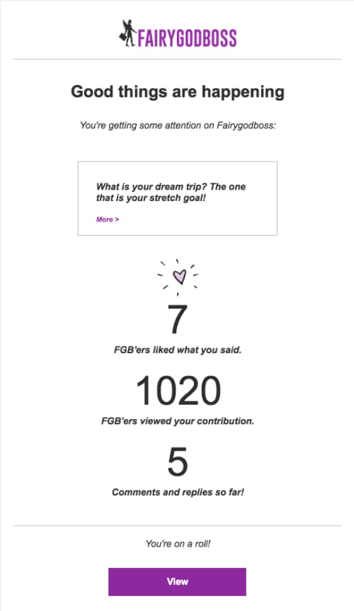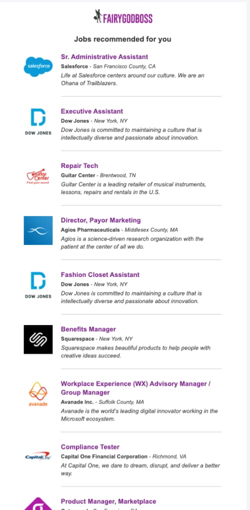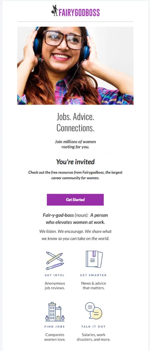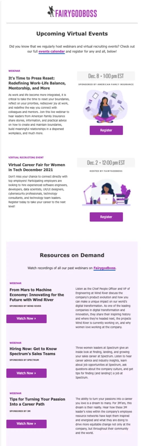At Fairygodboss, we use emails to keep our community members informed about their job search, the companies they’ve reviewed and changes to our website. We also send emails to keep FGB’ers updated with career advice, community posts and virtual career fair information.