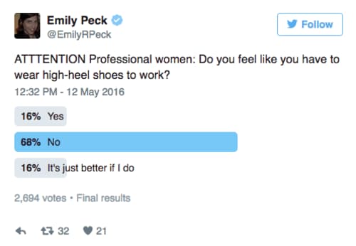 Other women acknowledge the reality that high heels can help women get ahead in their jobs. The good news is that based on a casual Twitter poll by journalist Emily Peck, the vast majority of women do not feel like they have to wear high-heel shoes to work.