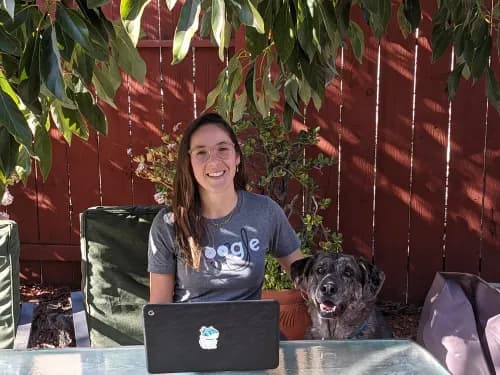 Emily and her dog, Milu, working from home. Photo courtesy of Google.