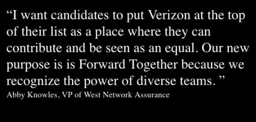 Beyond her role, Abby has contributed to Verizon’s diverse culture by co-hosting career advancement information sessions for V Teamers in different Employee Resource Groups — including Black Resource Association of Verizon Employees (BRAVE), Hispanic Support Organization (HSO) and Women’s Association of Verizon Employees (WAVE). Every day, she works to foster an environment that welcomes candidates from diverse backgrounds and industries, continuing in our mission to promote a culture of inclusion.