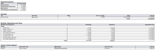 This pay stub offers a summary of deductions, including the gross amount, total personal deductions, the net amount, and total employer contributions. It includes a breakdown of the taxes deducted, as well as the rate of pay per hour and the number of hours worked.