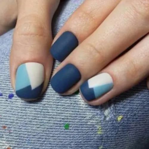 This matte look from Pinterest pairs plain blue nails with geometric accent nails—which is bold enough to add visual interest, but professional enough to work in a more creative workplace.
