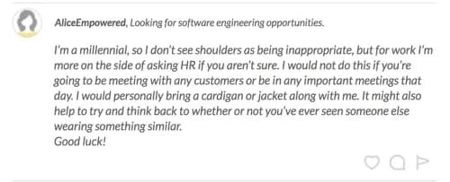 One woman in the FGB Community suggested wearing a cardigan over the strapless top. A blazer or a jacket of some kind could also work — so long as your shoulders are covered, these FGB'ers said, professionalism would be maintained.