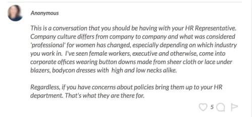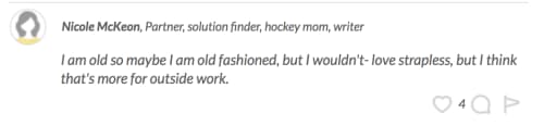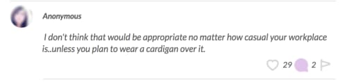 The above FGB’er, for instance, doesn’t think strapless shirts should be worn at work, ever. Other women in the FGB Community, who said they also have more conservative approaches to workwear, weighed in similarly, saying that strapless tops could show too much cleavage or accidentally fall down on you while you’re in the office.
