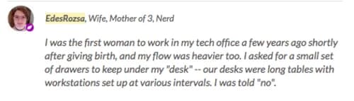“I was the first woman to work in my tech office a few years ago shortly after giving birth, and my flow was heavier, too,” the woman began. “So I asked for a small set of drawers to keep under my ‘desk’ — our desks were long tables with workstations set up at various intervals. I was told no.”