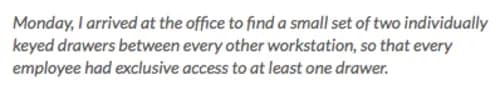 “Monday, I arrived at the office to find a small set of two individually keyed drawers between every other workstation, so that every employee had exclusive access to at least one drawer.”