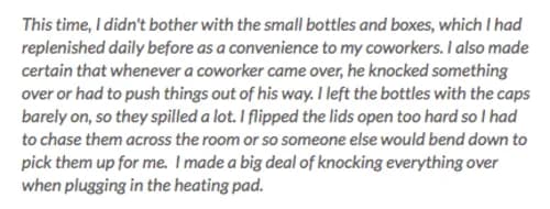 “I put it all on my desk, next to my screen. Everything had fit very nicely into the shoebox before, but I was really peeved," she wrote. "This time, I didn't bother with the small bottles and boxes, which I had replenished daily before as a convenience to my coworkers. I also made certain that whenever a coworker came over, he knocked something over or had to push things out of his way. I left the bottles with the caps barely on, so they spilled a lot. I flipped the lids open too hard so I had to chase them across the room or so someone else would bend down to pick them up for me. I made a big deal of knocking everything over when plugging in the heating pad."