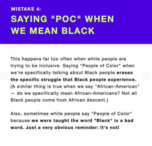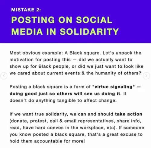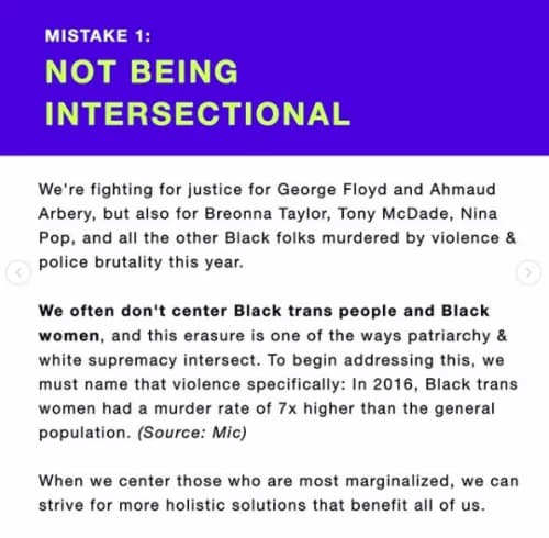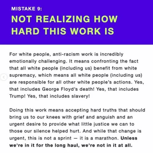 For many, this was of thinking is new. Even if it's not, as with taking on any difficult task, growing to be anti-racist and a strong accomplice of Black people comes with mistakes. Here are nine of those mistakes, as highlighted by writer, speaker and activist Jen Winston (@jenerous) in a recent Instagram post. She also shares how to cut down on these mistakes and grow as an anti-racist. You can click on any of the screenshots to view her full post.