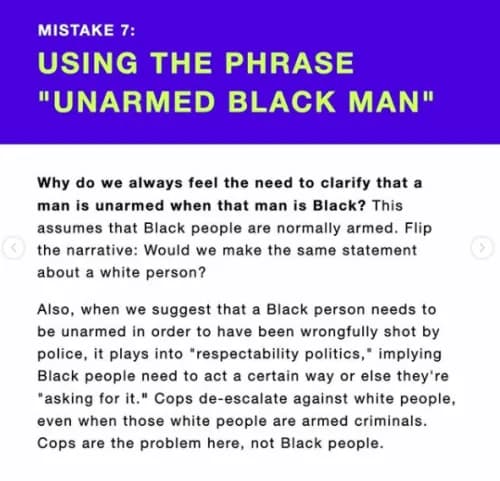 As Winston says, this seemingly innocuous statement suggests Black men are usually armed — an incredibly dangerous stereotype to reinforce.