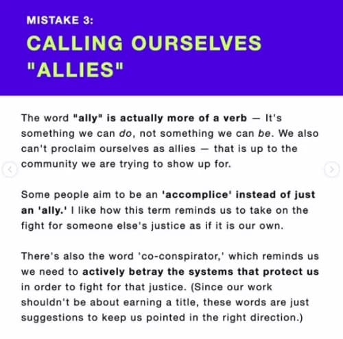 You can't call yourself an ally to the Black community — only Black people have that power. Instead, refer to yourself as an "accomplice" in changing racist systems.