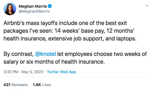 Earlier this week, Airbnb made headlines when announcing on May 5th that it had laid off 25% of its workers. Like countless other companies, the economic impacts of COVID have hit the online marketplace for tourism hard. Unlike other companies, though, news of Airbnb’s workforce reduction has centered largely around the company’s efforts to handle those layoffs as humanely as possible.